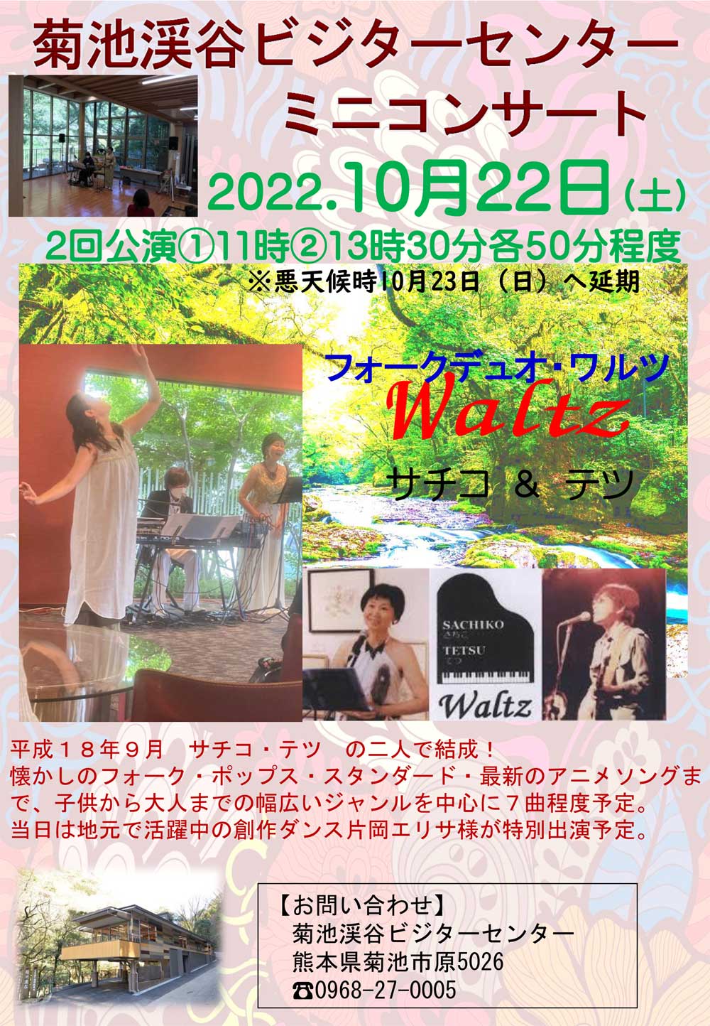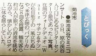 The other day (October 12th) at the Kikuchi Valley Visitor Center, Kikuchi was held for the fourth time this year. Resident folk dio “Waltz” held a mini concert♪ The combination of the valley location and the music played by Waltz was soothing ♪